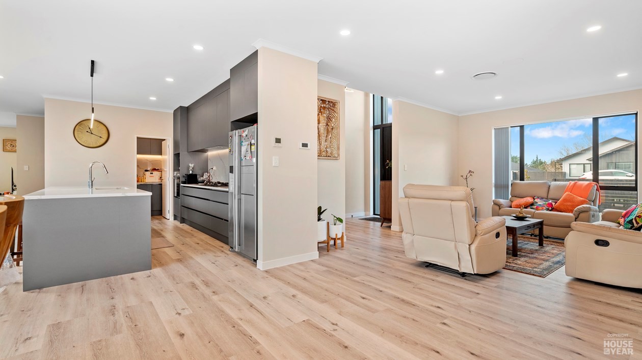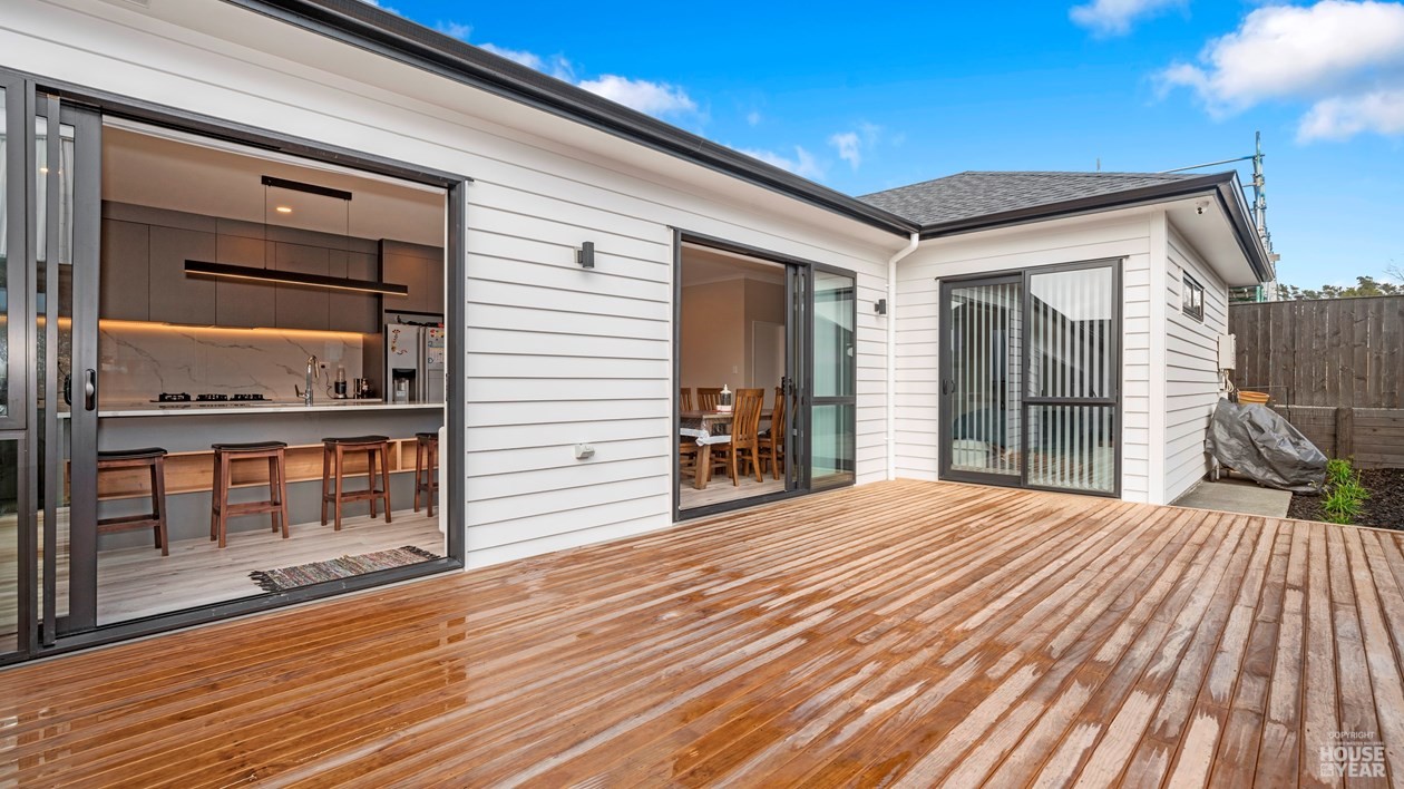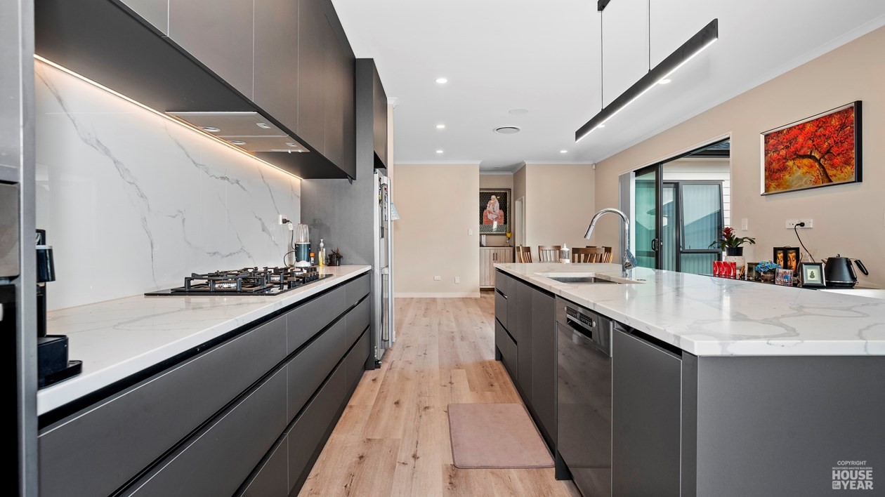 House of the Year - Silver Award 2022 This impeccably designed single-level residence in the heart of Milldale reflects a balance of functionality, light and refined detail. Set on a north-facing 514sqm section, the 203sqm layout provides four bedrooms, two bathrooms (including an ensuite), two living zones and a generous double garage — creating a home that is both practical and beautifully proportioned. At its centre, a light-filled open-plan kitchen, dining and living area forms the social heart of the home. Large sliding doors extend this space to a sheltered outdoor zone and expansive deck, ideal for relaxed family living or entertaining. The kitchen pairs form with function, featuring an island bench, walk-in pantry, and a refined palette of grey cabinetry and white benchtops that convey quiet sophistication. A neutral interior scheme, ash-tone flooring and recessed lighting establish a calm, contemporary atmosphere, while partial walls define each living space without interrupting flow. The main suite, positioned away from the family areas, provides a private retreat complete with ensuite and ample storage.